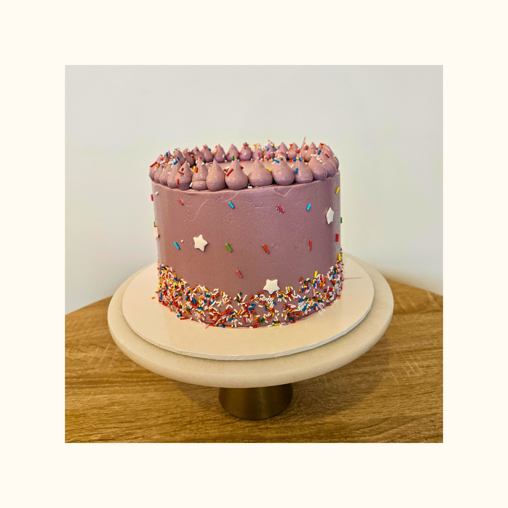 This playful and vibrant creation features a smooth purple buttercream frosting, accented with a festive 'sprinkle rim' at the base and a crown of piped dollops on top.